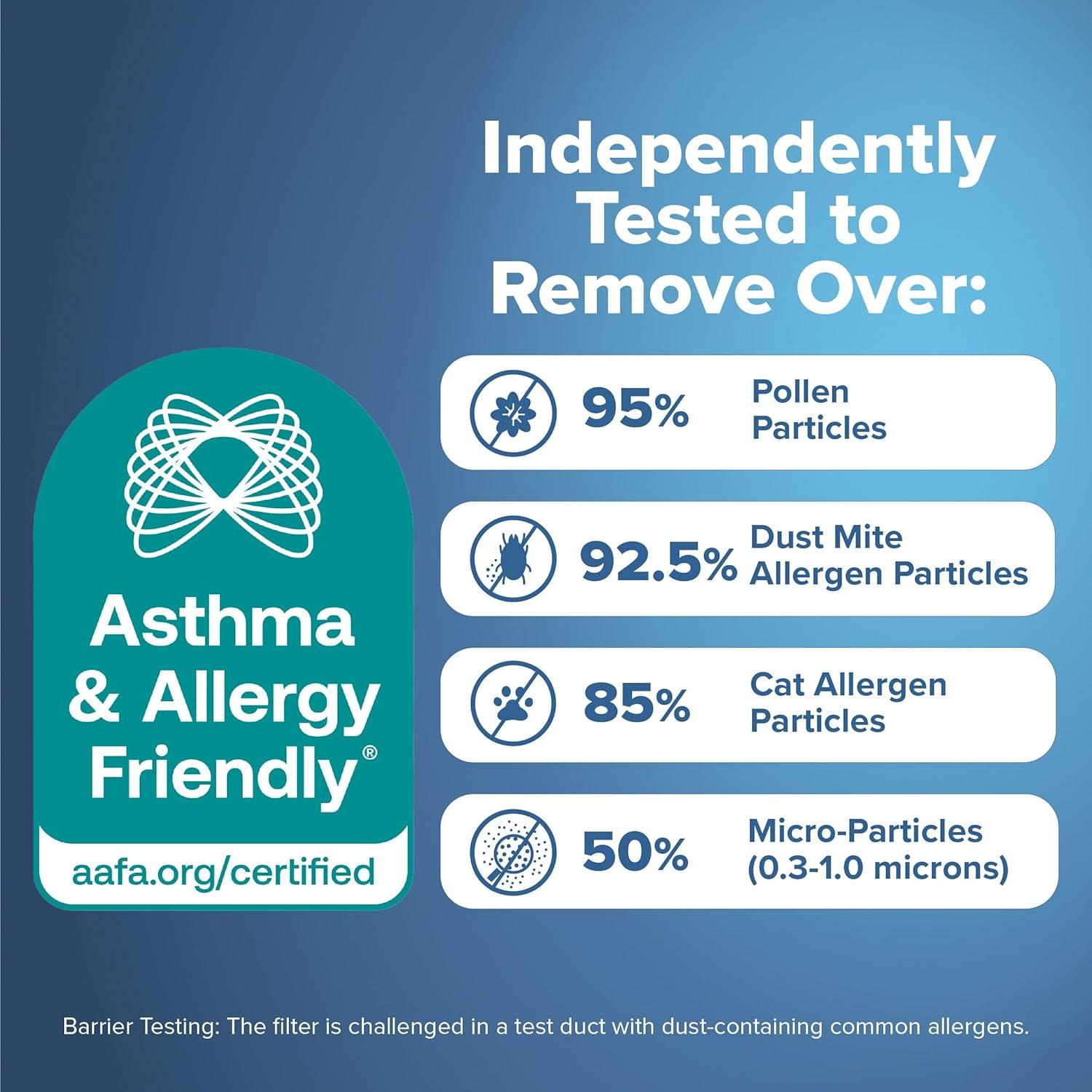CERTIFIED Asthma & Allergy Friendly. Independently tested to strict standards by a third party to remove over 95% pollen, 92.5% Dust Mite Allergen, 85% Cat Allergen, and 50% microparticles. (Challenged in a test duct with dust containing common allergens, specific to Filtrete MPR 1000 Refillable Air Filter)