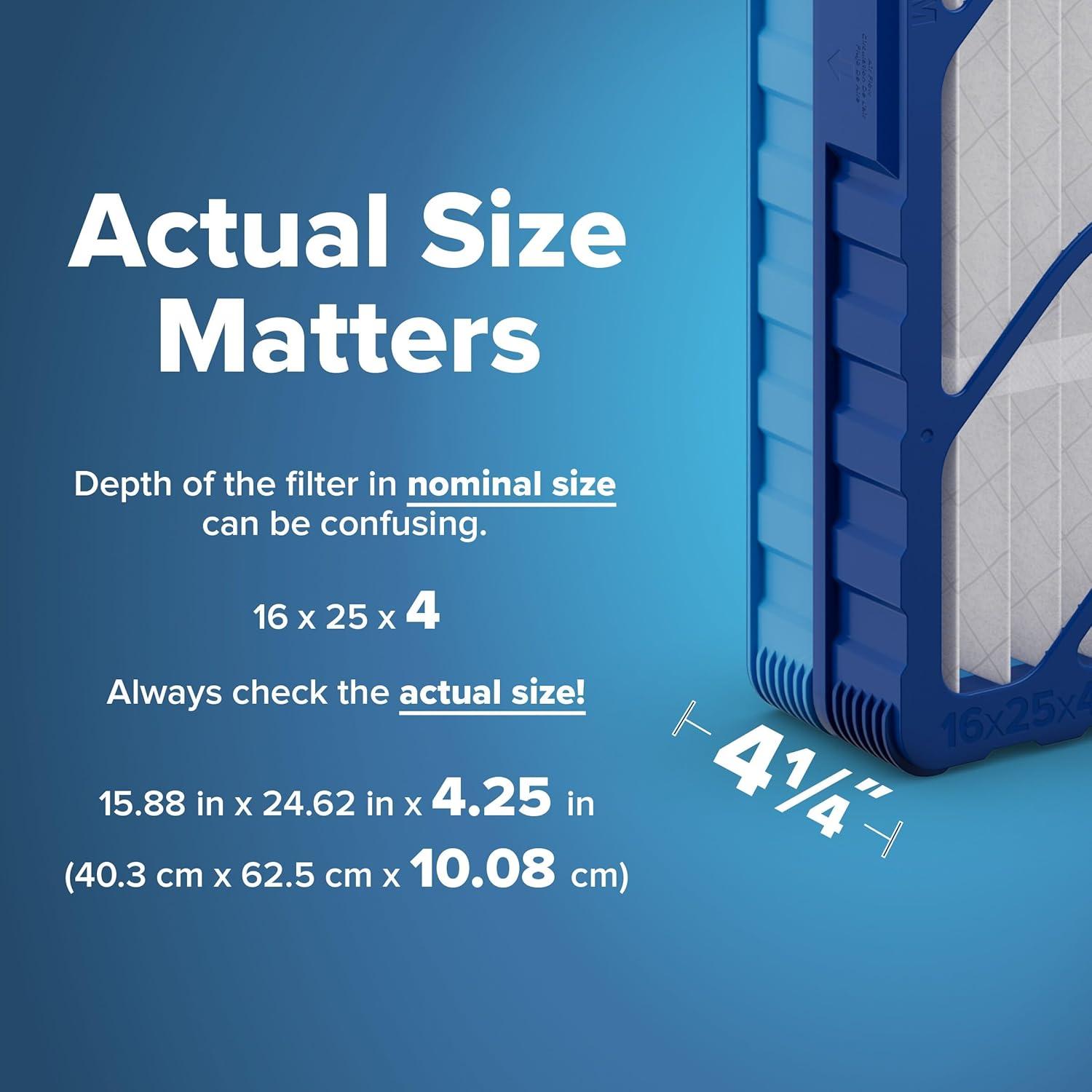 FITS Filtrete Refillable Air Filter Frame 16x25x4: The frame’s exact dimensions are 15.88 in x 24.62 in x 4.25 in (40.3 cm x 62.5 cm x 10.8 cm)