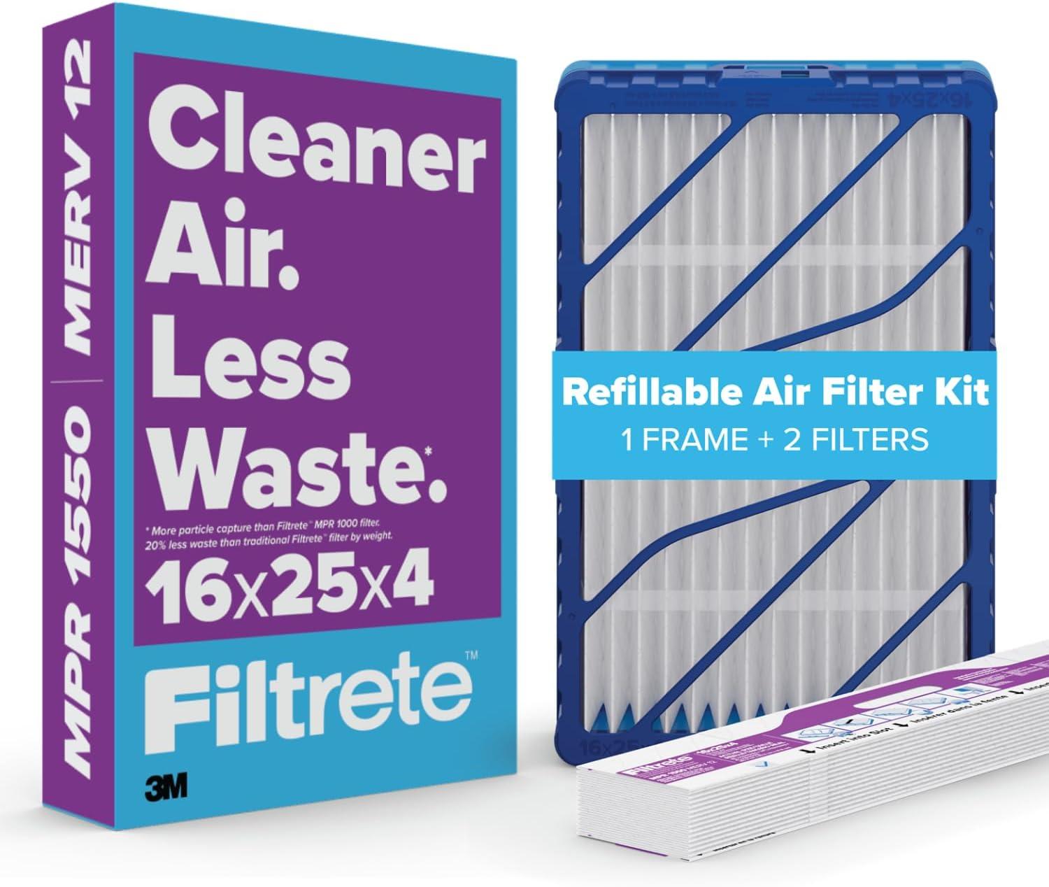 The Filtrete™ Refillable Air Filter comes with two collapsable air filters. These fit in the Filtrete™ Brand Refillable Air Filter frame, which is designed to last for up to 20 years.* The filter captures 2X more microparticles than the MERV 11 minimum requirements and is Certified Asthma & Allergy Friendly®, while creating 20% less waste.** Save money on refills with collapsible filters that take up 75% less space than traditional air filters, and are packaged with curbside recyclable materials.*** The refillable filter lasts up to a year, and never sweat forgetting to replace the filter with 90, 180, and 365-day reminders from the Filtrete™ Smart App. It's a small change, with a big impact.  *Excludes damages, abuses, or alterations. **Microparticles are 0.3- 1.0 microns in size. Based on weight. ***Comparable to equivalent size and Filtrete™ MPR Air Filters, based on MSRP.