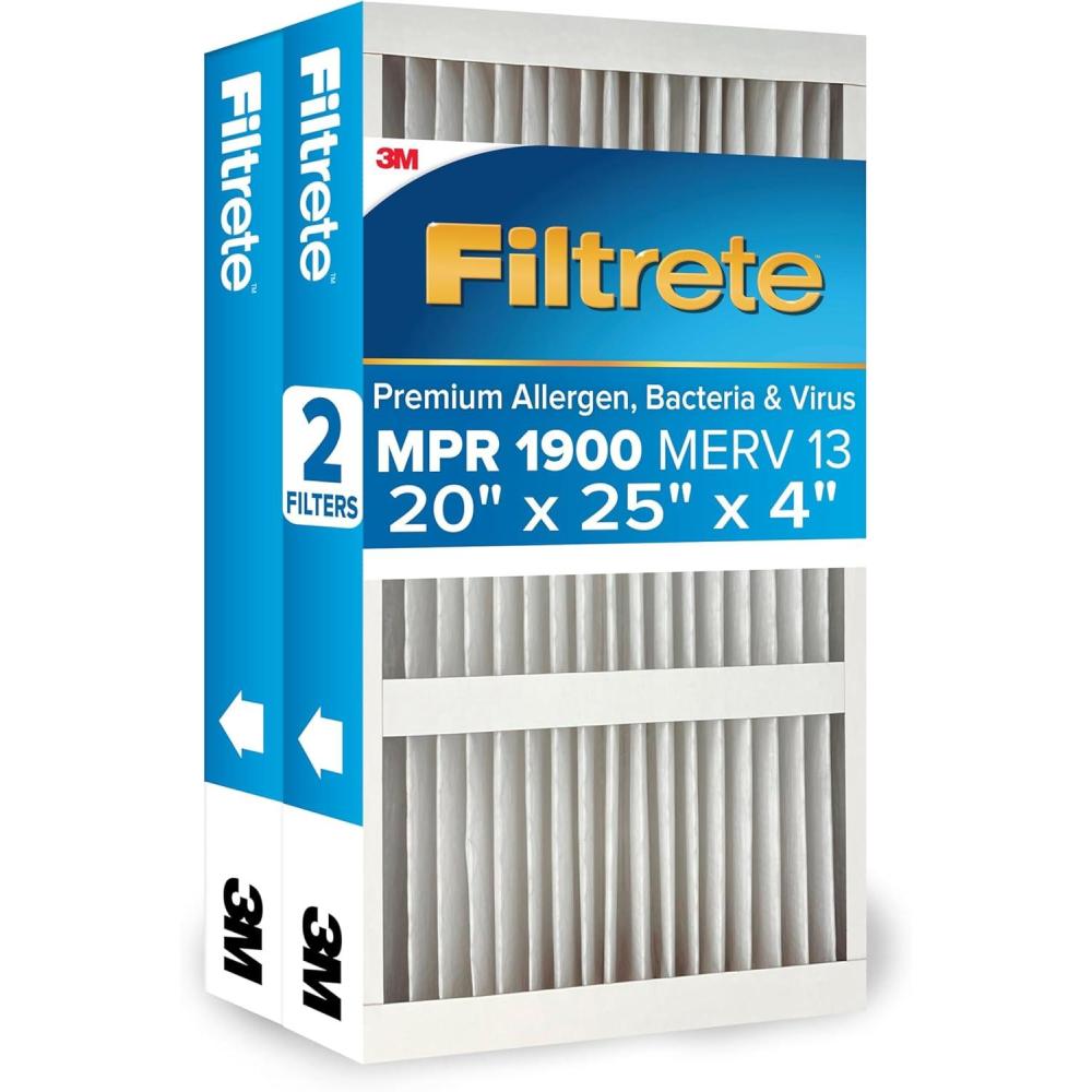 Filtrete 20x25x5 AC Furnace Air Filter, MERV 13, MPR 1900, Premium Allergen, Bacteria & Virus Filter, Electrostatic Air Cleaning Filter, 2-Pack (Actual Size 19.56 x 24.13 x 4.75 in)(20x20x4)